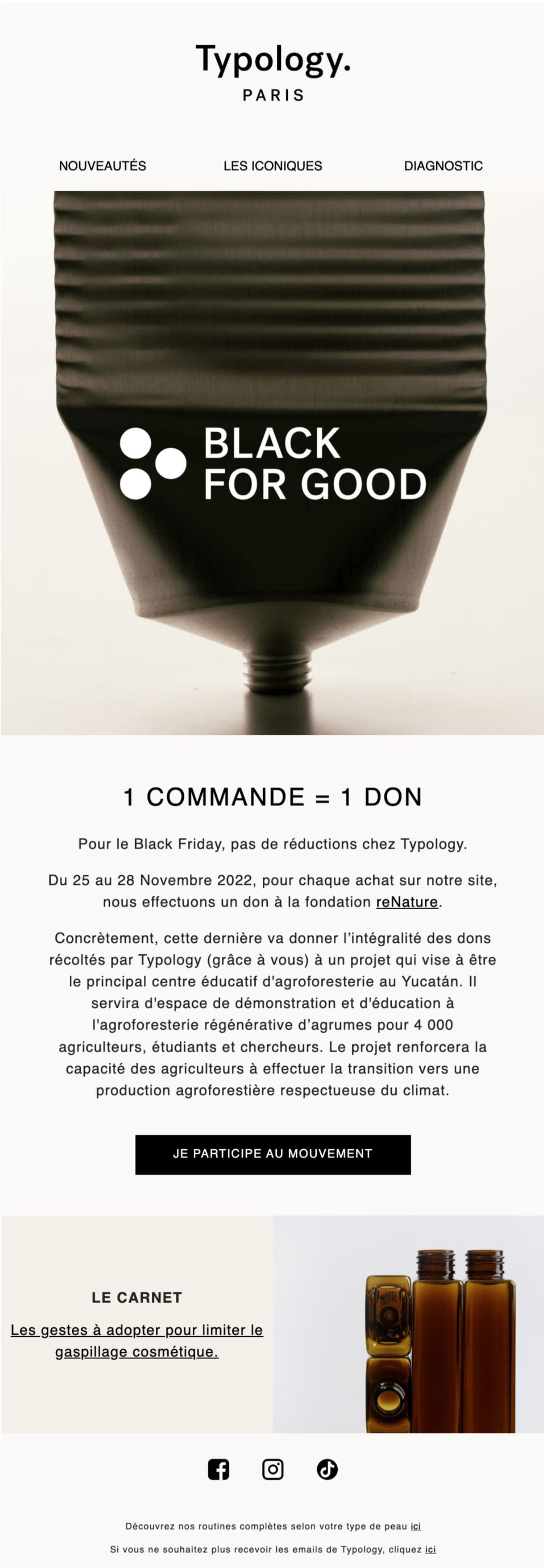 Même si tu choisis de ne pas faire Black Friday, envoyer un email à cette période pour communiquer sur ton positionnement vis à vis des promotions et de la surconsommation peut être un excellent moyen de :